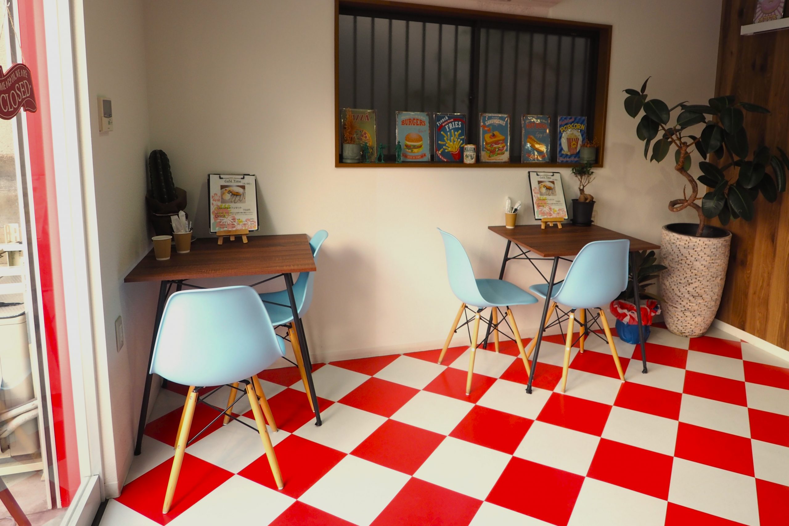 赤と白のチェック柄の床が、海外のショップを訪れたような非日常感を演出。大切な人へ笑顔を届けるきっかけを、生ドーナツに込めて手渡します。