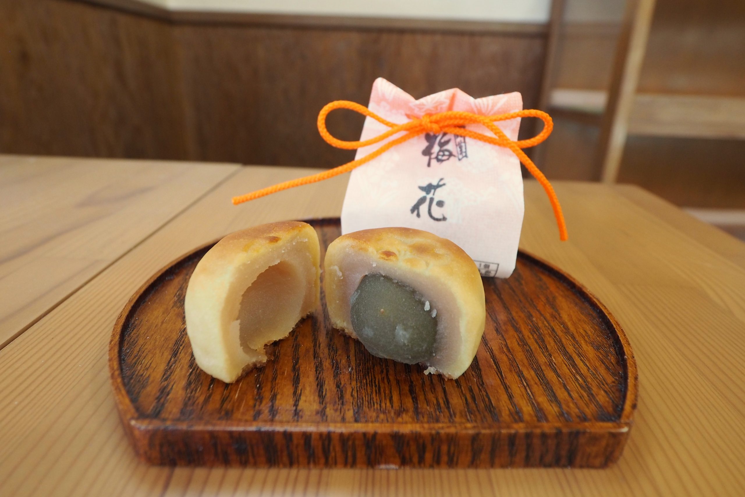 地元・城陽の情景をお菓子に映し出すことが、私たちの使命だと考えています。「きづの川音」は、ふんわりとしたスポンジ生地で、かつて木津川を往来していた「渡し船」をイメージ。中に包んだ白あんと抹茶のお餅で、地元の茶畑や川の空気感を表現しました。和菓子に馴染みのない方でもコーヒーと一緒に楽しめると、好評です。城陽名産の梅の実を丸ごと包んだ「梅花」、黄味あんとクルミの相性がよい「五里の道」も人気です。