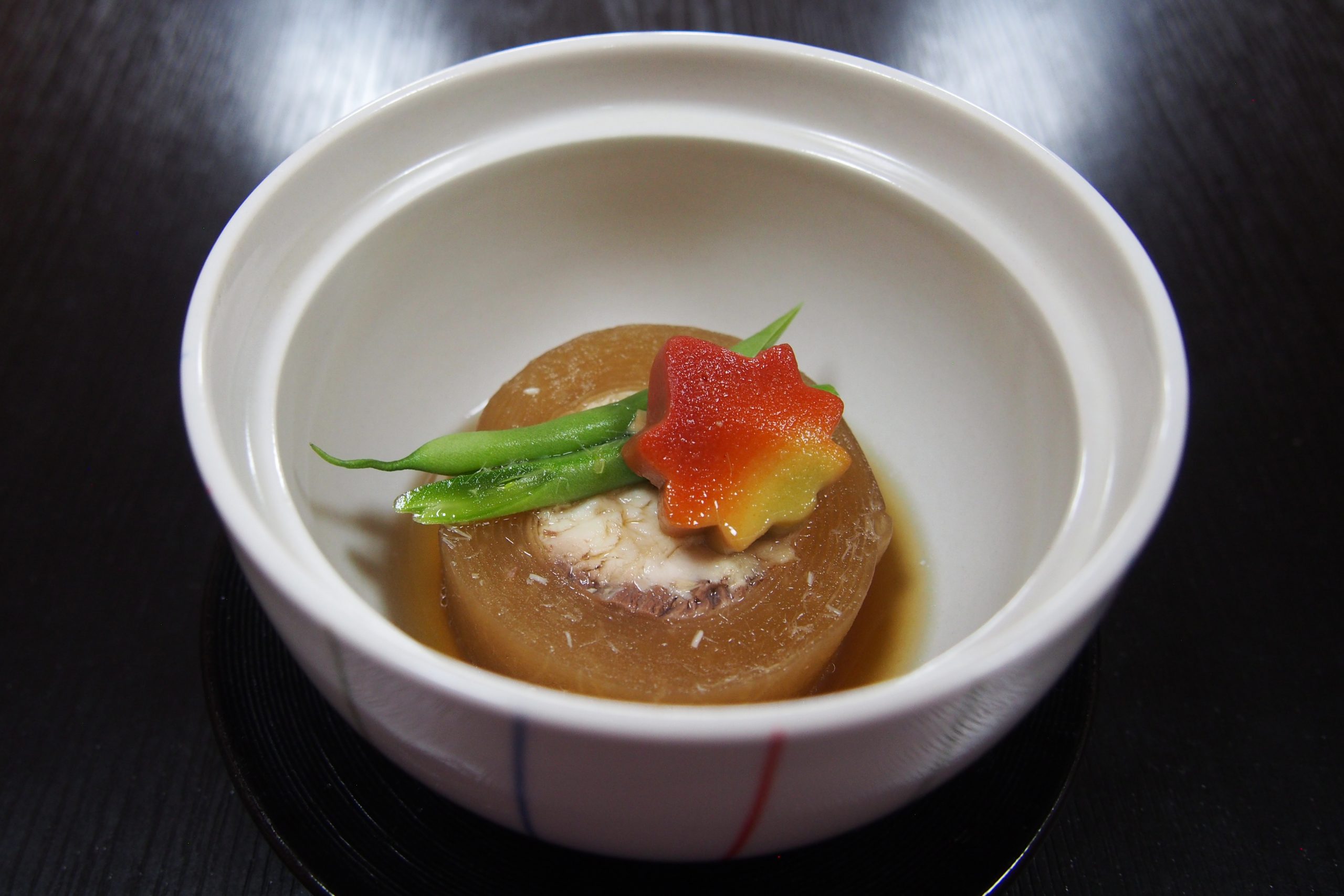こだわりのだしで作るのが「ぶり大根」。かつらむきにした大根にブリの柵を巻いて炊いています。「何これ?」と驚かれるロールケーキのような見た目。ひと口食べれば、じゅわっと染み込んだだしの味が感じられます。おまかせの会席料理に「ぶり大根だけは入れて」とリクエストされることも。一度は食べていただきたい自信作です。