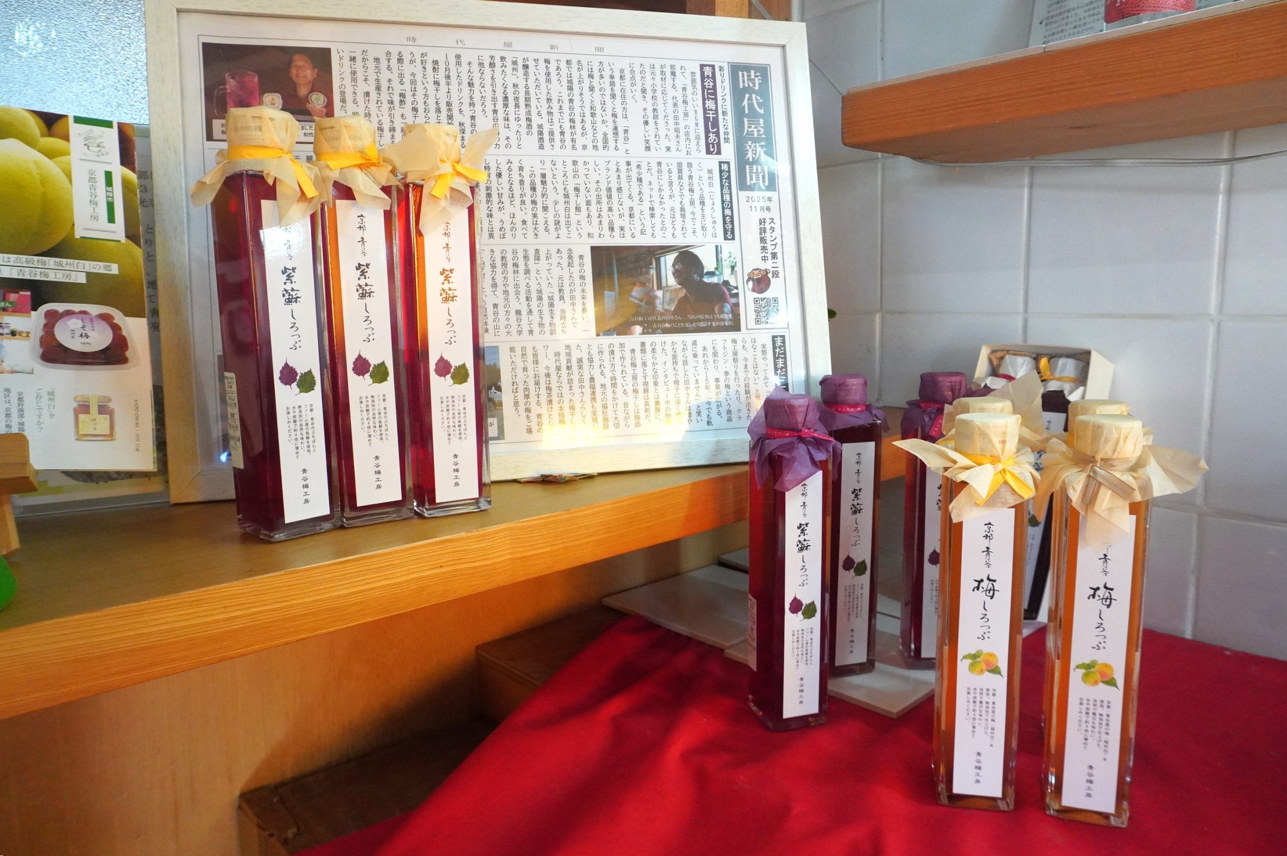 ほかにも、朝食のトーストやヨーグルトに合う「梅ジャム」、炭酸で割ってさっぱり飲める「梅しろっぷ」、料理の隠し味になる「梅びしお」など、加工品もございます。mitosaya 薬草園蒸留所コラボのブランデー、京都蒸留所のジン「季の美(きのび)」の原料として採用されるなど、新しい試みをしています。