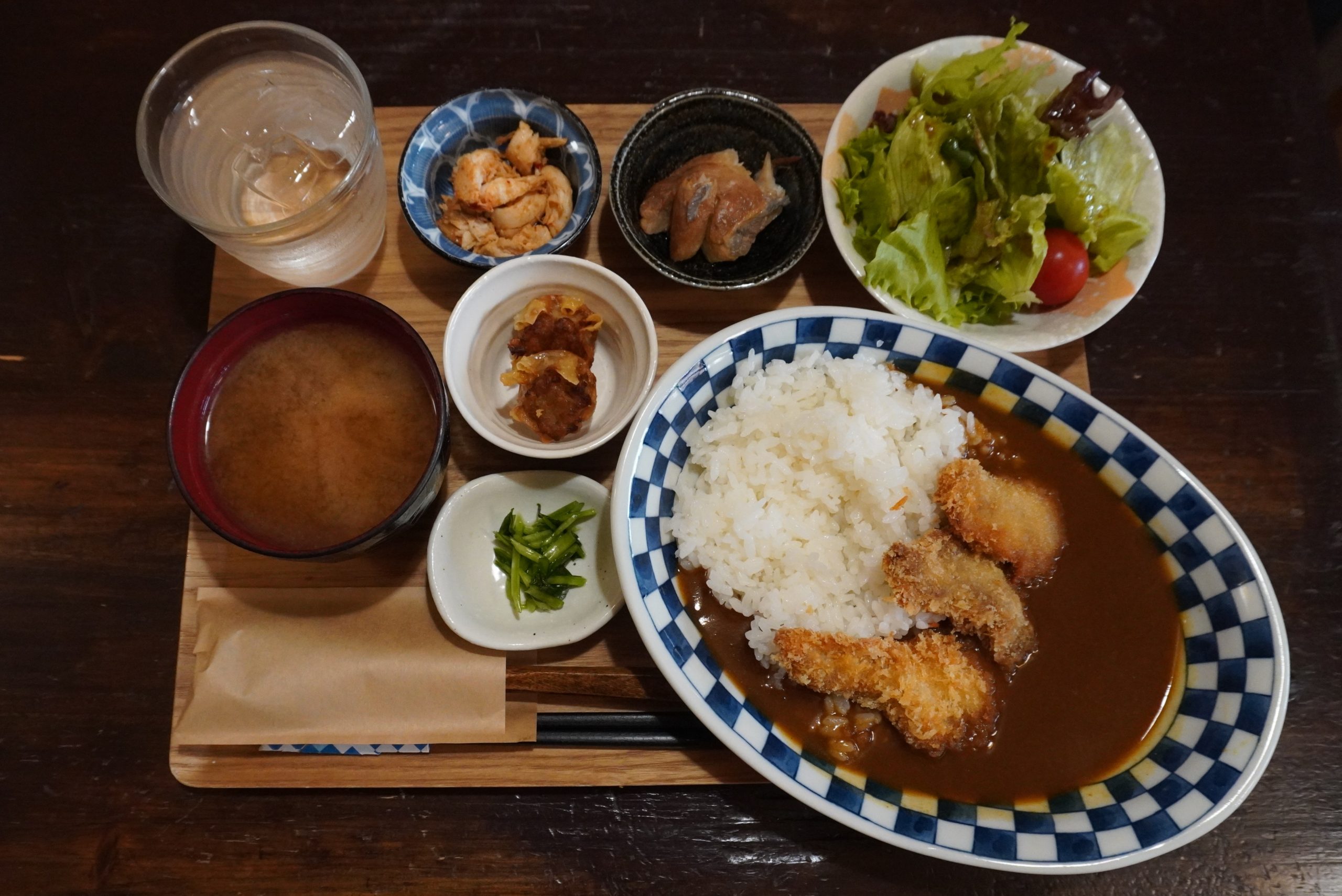 きままに御膳のメインは、鶏のからあげ、とんかつ、豚焼き肉、生姜焼きから。オリジナル・カレーは、豚しゃぶ、とんかつ、魚フライからトッピングを選べます。どちらも小鉢3種、ミニサラダ、ごはん、みそ汁、漬け物、ドリンク付き。税込1,000円でお腹いっぱい食べられます。